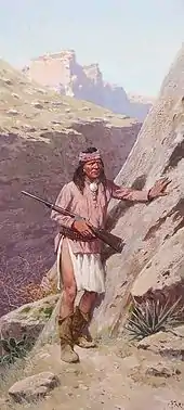 Parker's small command was pinned down by 40 or more rifles. He ordered veteran Sergeant George Jordan to get to higher ground and fire down upon the Apaches. It was a fierce battle, with both sides suffering casualties. Jordan's small group was attacked but was able to hold their position and allow the troops in the canyon to retreat.[2] The Medal of Honor was awarded Sergeant Thomas Shaw[3] and Sergeant Jordan (who was also cited for his leadership at the Battle of Fort Tularosa[4]