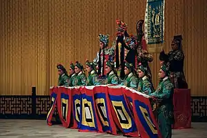 Lü Bu's biographies in the Sanguozhi and the Houhanshu mention that Lü Bu had a secret affair with one of Dong Zhuo's maids, and was afraid that Dong would find out.[17] Besides, he already bore a grudge against Dong Zhuo, who threw jis (a type of halberd) at him on some occasions to vent his frustration, but Lü Bu dodged the weapons and Dong Zhuo's anger subsided.[18] There is no historical evidence to support the maid's name being "Diaochan". That name likely referred to the sable (貂; diao) tails and jade decorations in the shape of cicadas (蟬; chan), which at the time adorned the headgear of high-ranking government officials.