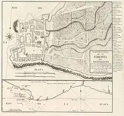 Frigate captain Frederico Mariath, the commander of the Brazilian ships in Colonia del Sacramento, had convened a council to decide how the defence of the town should be carried out. Mariath suggested that his four ships be anchored under the protection of the bastions of Carmen and Santa Rita, with their sides facing the port, as to provide fire support. This proposal was accepted by Jorge Rodrigues. Eight of the ships' cannons were disembarked to form two batteries on land: one was placed at the Tambor bastion, in order to protect the ships and to prevent the Argentines from disembarking on the town's mole, and the other was placed between the bastions of São Pedro and São Miguel.[16] Four hours after having sent his envoy and upon receiving the answer, admiral Brown ordered his men to begin the attack on Colonia del Sacramento.[15]