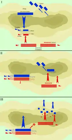 - The right half of the Macedonian phalanx was formed in double depth and they advanced downhill against the Roman left wing.