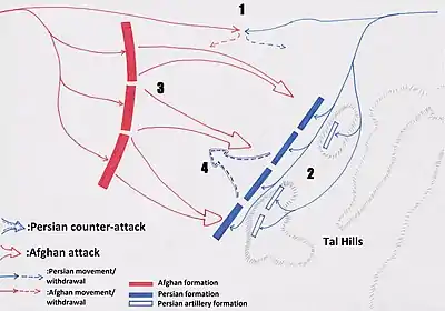 A rearguard of a few thousand mounted troops covered Nader's ongoing deployment to the left, on the Tal hills. In a break with conventional deployment patterns in oriental armies of this period Nader placed his artillery pieces behind his line infantry, where from their elevated positions on the high ground they overlooked the compact formations of Persian Jazāyerchi (musketeers) at the base of the hills as well as the valley in front of them.[3] The Afghan left which had come into contact with the Persian rearguard and instead of pursuing them fell back in line with the rest of Ashraf's army when the rearguard was withdrawn. Ashraf gave the order for an all out charge driving his cavalry army of 40,000 riders towards the Persians whom were now awaiting at the foot of the Tal hills. The terrifying horde of Afghan riders charged forward with incredible speed and impetus.