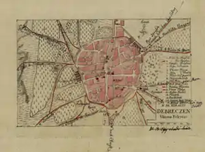 The historian Róbert Hermann and Attila Horváth point out that Nagysándor deployed his troops, not in a very lucky fashion. If Nagysándor wanted to retreat safely towards Derecske, after forcing the Russians, with the shootings of his artillery, to deploy their troops for battle and, in this way delay their pursuit, he would have deployed his corps on the southwestern part of the city.[20] Instead of this Nagysándor deployed his troops in a line in front of the city. He deployed on the left flank the infantry division of 4500 soldiers led by Colonel János Máriássy and 16 cannons.[6][21] Máriássy managed to hide his division behind the hills and mounds which lay in front of them.[21] The center stretching from the Köntös dam to Kokasló was occupied by the 1500-strong infantry division and 6 cannons of Lieutenant colonel János Bobich. The brick pits from Kokasló were defended by the 6. Honvéd battalion and the Defense Battalion of Hont County with 3 cannons, while the Köntös garden was held by 3 battalions and 3 cannons.[21] On the right flank the Korponay division was placed from Kokasló to the Nyulas taproom with around 2500 weak infantry, which partially lacked firearms, supported by the newly formed 96. Honvéd battalion, 12 cannons and 1 ½ hussar company.[21] In the large forested area from the north of the town, called Nagyerdő (Great Forest) was sent only 2 companies of the 89. Honvéd battalion and a platoon of the 14. Lehel hussar regiment ordered to make big noise, in order to "confuse the enemy".[21] The vanguard was made by 4 companies of the 1. Imperial hussar regiment.[21] Nagysándor placed 4 companies of the 8. Hussar Regiment, on the left, another four on the right wing, while the remaining 4 companies he kept as reserve, together with a battalion of militia armed with lances, probably from the Korponay division.[11][21] In front of his lines the cornfield blocked his view, while on the right flank he left the Debrecen woods (called Nagyerdő) almost completely unoccupied, which enabled the Russians to deploy their troops and encircle the right wing undetected.[6]
