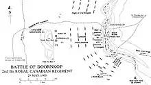 Two Canadian units remained temporarily behind to draw Boer fire and deflect the enemy's attention from the flanking manoeuvre taking place south of the river. After enduring about three hours of heavy Boer fire, the Canadian Mounted Rifles finally galloped back across the river, followed soon thereafter by the Royal Canadian Dragoons. The two units had played a vital part in the battle, and suffered only light casualties. The cavalry succeeded in seizing a new crossing of the river to the west, but it was still be up to the infantry, including the 2nd Battalion, Royal Canadian Regiment of Infantry, to advance and attack Doornkop. As part of the general attack, the Canadian infantry moved forward over a low ridge and up a long slope under fire the whole way. The Boers had set fire to the brush and for part of the distance the troops had to run through flames, while the smoke made navigation and control difficult. By clever use of the ground, aided by the aggressive support of the battalion machine gun section, the Canadians captured their objective with losses of only seven men wounded.[4]