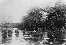 The Japanese prepared a renewed attack by elements of the 20th Division northwest of Afua, commencing around 15–16 July.[30] This effort resulted in heavy clashes with elements of the U.S. 112th Cavalry and 127th Infantry Regiments on the southern flank of the Allied line,[31] but failed to permanently secure the village for the Japanese who captured it at least twice, before being forced to withdraw.[3] After the first effort against Afua, the remainder of July saw heavy fighting west of the river as platoon/troop, company/squadron and battalion-sized units clashed in the jungle along the coast and around the Torricelli Mountains.[32][33] As the fighting devolved into hand-to-hand combat in the jungle,[34] heavy pressure was maintained upon some pockets of American troops still clinging to their positions at the river as they became encircled by Japanese troops who were determined on wiping them out and securing the Afua area. By 22 July, the Japanese had captured Afua, but the following day reinforcements from the U.S. 127th Infantry Regiment began relieving the isolated cavalrymen.[35] In response, the Japanese commander, Adachi, decided to launch another effort around Afua, committing his reserve regiment, the 66th, and the bulk of the 41st Division to an all out attack alongside the 20th Division. Commencing on 29 July, and spanning several days, the attack captured some ground, but resulted in heavy Japanese casualties.[36]