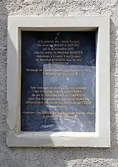 In the Russian novel War and Peace, Leo Tolstoy devoted several pages to the battle, its prelude, and its aftermath, and the delivery of its news to Francis II (Holy Roman Emperor) by Prince Andrew.[57][58]: 97 Between Dürenstein and Rossatz, at the edge of the Loiben plain, stands the "Little Frenchman" memorial (see image) erected in 1905 to commemorate the battle; it bears the names of Mortier, Gazan, Kutuzov, Schmitt, and others on a copper-engraved plate.[54]