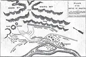 En route to Chihuahua, Doniphan's regiment was attacked by a Mexican army about thirty miles from El Paso del Norte and about 9 miles south of Las Cruces, New Mexico, at Bracito or Brazito on the Rio Grande.[2]: 152 Since it was Christmas, Doniphan had halted his men's march at 1 PM that day.[2]: 152 However, they spotted the dust cloud of a Mexican scouting party to the south and Colonel Doniphan promptly ordered his men to prepare for battle.[2]: 152