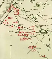 During the six months stalemate following the Second Battle of Gaza, the el Buqqar ridge had been the objective of Desert Column/Desert Mounted Corps strategic marches on 5–7, 10 May and 2–3, 6–7, 14 and 24–5 June.[1][2][3][4][5] On 19 July, the Anzac Mounted Division with the Australian Mounted Division advanced towards el Buqqar to engage an Ottoman force of two regiments of cavalry supported by infantry and four light guns, occupying the area. The 1st Light Horse Brigade attacked the force capturing 11 prisoners before the Ottoman force withdrew behind entrenchments. One of the prisoner described the attacking force as part of the Ottoman 16th Division which had been protecting a new corps commander while he made a personal reconnaissance. By the next morning the area was clear of Ottoman troops.[6] Ottoman patrols were dispersed from el Buqqar ridge on 21 and 29 September,[7] and on 12–14 October.[8] The 3rd Light Horse Brigade took over from the 5th Mounted Brigade, duties of Outpost Brigade on 16 October when it was noted dawn occurred at 05:00 and dusk at 17:30.[9]