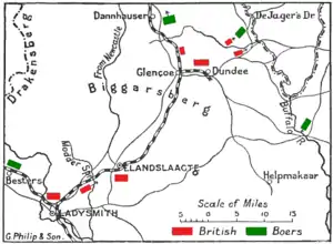 When the Boers invaded Natal, a force under General Johannes Kock occupied the railway station at Elandslaagte on 19 October 1899, thus cutting the communications between the main British force at Ladysmith and a detachment at Dundee. De Kock's forces consisted mainly of men of the Johannesburg Commando with detachments of German, French, Dutch, American, and Irish Boer foreign volunteers.[2][3]
