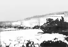 The main drive against Elsenborn Ridge was launched in the forests east of Rocherath-Krinkelt on the early morning of 17 December. This attack was begun by tank and panzergrenadier units of 12th SS Panzer Division. 989th Infantry Regiment of 277th succeeded, after heavy and costly combat in the woods, in overrunning the forward American positions guarding the trails to the villages, capturing a large number of prisoners and leaving many small units isolated. By 11:00, this attack had driven units of 99th Infantry Division back into the area of Rocherath-Krinkelt. These units were joined by forces of 2nd Infantry Division moving into the villages from the north. The German attack swiftly bogged down against the heavy small arms and machine gun fire from the prepared positions of 99th Infantry Division on their flanks. The German infantry struggled to make their way through the dense woods and heavy brush in their path. The German forces also drew a rapid response from American artillery, who had registered the forward positions of their infantry. The artillery fired on the exposed advancing Germans while the American troops remained in their covered foxholes. The troops around the villages were assisted by tanks from 741st Tank Battalion, assisted by a company of 644th Tank Destroyer Battalion equipped with M10 tank destroyers, a company of 612th Tank Destroyer Battalion, and a few towed 3-inch guns from the 801st Tank Destroyer Battalion. They were instrumental in helping hold back the German advance in the fighting in and around Rocherath-Krinkelt.[7]