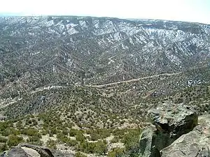 Following the Battle of Cañada, Sterling Price on 27 Jan. advanced up the Rio del Norte (Rio Grande), to Luceros where he was joined by Capt. Burgwin's Company, 1st Dragoons, Lt. Boone's Company A, 2d Regiment Missouri Mounted Volunteers, and Lt. Wilson's 1st Dragoons, bringing Price's force to 479 men.[1] On 29 Jan., Price marched to La Joya, where sixty to eighty insurgents were posted on either side of the canyon.[1] Finding the road by Embudo impractical for artillery or wagons, Price detached three companies under Captain John H.K. Burgwin, Captain Ceran St. Vrain and Lieutenant B.F. White, amounting to 180 men.[1]