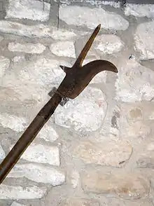 Flodden was essentially a victory of the bill used by the English over the pike used by the Scots. The pike was an effective weapon only in a battle of movement, especially to withstand a cavalry charge. The Scottish pikes were described by the author of the Trewe Encounter as "keen and sharp spears 5 yards long".[73] Although the pike had become a Swiss weapon of choice and represented modern warfare, the hilly terrain of Northumberland, the nature of the combat, and the slippery footing did not allow it to be employed to the best effect.[74] Bishop Ruthall reported to Thomas Wolsey, 'the bills disappointed the Scots of their long spears, on which they relied.'[75] The infantrymen at Flodden, both Scots and English, had fought essentially like their ancestors, and Flodden has been described as the last great medieval battle in the British Isles. This was the last time that bill and pike would come together as equals in battle. Two years later Francis I of France defeated the Swiss pikemen at the Battle of Marignano, using a combination of heavy cavalry and artillery, ushering in a new era in the history of war. An official English diplomatic report issued by Brian Tuke noted the Scots' iron spears and their initial "very good order after the German fashion", but concluded that "the English halberdiers decided the whole affair, so that in the battle the bows and ordnance were of little use."[76]