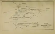 On Sunday 4 September, James and the Scottish army had taken up a position at Flodden Edge, a hill to the south of Branxton. This was an immensely strong natural feature since the flanks were protected by marshes on one side and steep slopes on the other, leaving only a direct approach.[35] The amount of fortification which James constructed on the hill is disputed; several antiquaries had mapped supposed ramparts and bastions there over the centuries, but excavations conducted between 2009 and 2015 found no trace of 16th century work and concluded that James may have reused some features of an Iron Age hill fort.[36]