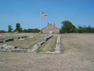 At 1 o'clock in the afternoon of August 20, Little Crow rode out alone into the open beyond the picket line west of the fort, close enough to be recognized but just out of musket range. After Sergeant Bishop offered to meet him at the picket line rather than rushing out in an attempt to capture him, the diversion was revealed as shots rang out from the wooded ravine near the northeast corner of the fort.[13] Little Crow's force of 400 Dakota[14] was only prevented from reaching the fort by Lieutenant Gere's decision to move his howitzer into the open northwest of the building while under fire from the Dakota and clear the field north of the fort with canister shot.[15]