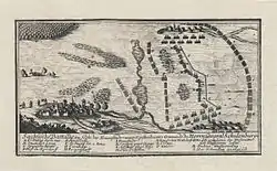 On the Saxon left flank, facing Rehnskiöld's infantry, the Russians were deployed with their uniforms inside-out so they would look more like Saxons with their red colors instead of the Russian-standard green. This was however an order from Schulenburg who questioned their battle skills to reveal the weakness of the flank.[10] The Swedish infantry assaulted the Saxon-Russian line frontally, under heavy cannon and musket fire. Upon discovering that the left wing of the enemy line was held by the Russian troops, Rhenskiöld directed his infantry to assault their positions, which were also being attacked from the rear by colonel von Krassow's cavalry. The Russian infantry were quickly surrounded and dispersed.
