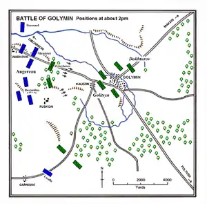 On the morning of 26 December, elements of Golitsyn's 4th Division reached Golymin. They were too exhausted to continue to Makow and Golitsyn also needed to wait for units of Sacken's 3rd Division. In the village he found Dokhturov, who had sent most of his 5th Division towards Makow, but remained at Golymin with a dragoon and an infantry regiment. Golitsyn hoped to rest his men before continuing their retreat.[17][18][19]