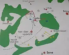 For a surprise attack on this camp from the east, the Prussian general Karl Friedrich von Hirschfeld gathered troops near Görzke, including four line battalions, fourteen Landwehr battalions and twelve squadrons of Landwehr cavalry that had previously been in western Brandenburg. On the evening of 26 August he had concentrated 10,350 infantry, 960 cavalrymen and 11 guns.[2] The next morning a forester from Steindorf near Lübnitz led the way for, Hirschfeld's contingent through the forest towards Hagelberg. Around 2 p.m. they reached the edge of the forest to the west of the camp, stood up in a makeshift position and attacked somewhat hastily. For the inexperienced Landwehr, the battle threatened to come to a bad end several times. Energetic officers like Lieutenant Colonel Friedrich August von der Marwitz succeeded time and again in putting the units in order.