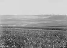 Situated to the south of both the village of Hamel and the Pear Trench, the Vaire and Hamel Woods were joined by a narrow strip of trees; the Hamel Wood was the northernmost of the two and situated in low ground that rose towards a hill where the Vaire Wood grew. To the west of the wooded area, on the other side of the road that linked Hamel with Villers-Bretonneux, the Germans had constructed a kidney-shaped trench, which the Australians had dubbed "Kidney" or "Vaire Trench".[48][38] Occupying a commanding view of the ground to the west, over which the Australian infantry had to assault, the position was reinforced with barbed wire, and anchored with multiple machine-gun posts.[49]