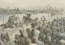 Immediately after this, the cavalry of the two sides clashed. Liebenzeller led forward the militia, armed with spears and Danish axes,[10] and ordered them to attack the horses of the knights. Meanwhile, Zorn had led the 300 crossbowmen out to the flank of the fight to engage the bishop's advancing infantry and prevent them from interfering in the fight with the knights.[11] The shooting of the bowmen was so effective that the infantry declined to advance further. The bishop’s cavalry was overwhelmed. Sixty knights were killed and another 73 captured.[12] Geroldseck was engaged in the struggle, having two horses killed under him before fleeing from the field on a third. His brother, Hermann, lay among the dead.[11] Geroldseck retired to Molsheim and abandoned his prerogatives over Strasbourg. He died in February 1263.