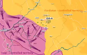 Hawija, which is located 50 kilometres (31 mi) west of Kirkuk city, had been a bastion of Sunni Arab insurgents since the United States-led invasion of Iraq in 2003.[20] In 2013, Iraqi Prime Minister Nouri al-Maliki ordered his forces to open fire on peaceful protesters in Hawija. In return, Sunnis became convinced of using violence to counter Maliki's sectarian policies while also giving substantial support to Islamic State of Iraq and the Levant.[21] The group captured the city in June 2014 when it seized control of most of northern and western Iraq.[20] It became isolated from the rest of the group's territory in July 2016 during the Mosul offensive and was its last stronghold in Iraq.[22] The offensive had been repeatedly delayed due to various sectarian issues, as well as disagreements over the involvement of the Peshmerga and the Popular Mobilization Forces militia.[23]