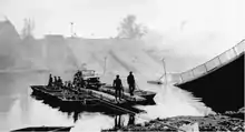 Before daylight on 4 April, the third battalion of the 100th Division's 398th Infantry Regiment slipped silently across the Neckar in assault boats a mile or so north of Heilbronn, starting from the suburb of Neckargartach.[3] As the men turned south toward the city after daybreak, a German battalion, using, in some cases, tunnels to emerge in the rear of the U.S. troops, counterattacked sharply. The ensuing fight forced the American infantrymen back to within a few hundred feet of the river. There they held, but not until another battalion of the 398th crossed under fire in late afternoon were they able to resume their advance. Even then they could penetrate no deeper than 1,000 yards (910 m), scarcely enough to rid the crossing site of small arms fire. Until the bridgehead could be expanded, engineers had no hope of building a bridge. Later on 4 April, General Burress of the 100th Division had the 397th Infantry Regiment cross the Neckar just south of the 398th's position.