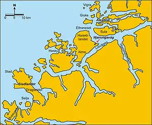 Jómsvíkinga saga offers two mutually contradictory descriptions of the bay on the coast of Sunnmøre in which the battle took place. According to the first one, Hjorungavágr lies on the landward side of the island Hoð (now Hareidlandet in Møre og Romsdal). According to the other, the bay is situated south of an island called Primsigð/Primsignd and north of an island called Horund. Both of these names are not in common use today.[6][7][8][9]