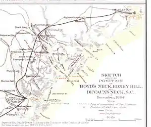 Hatch's expeditionary force left Hilton Head, South Carolina, for Boyd’s Neck (above Beaufort) on November 28. It consisted of 5,000 men—two brigades of the Coast Division of the Department of the South, one naval brigade, and portions of three batteries of light artillery. They steamed up the Broad River in transports to cut the Charleston and Savannah Railroad near Pocotaligo. Due to a heavy fog the troops were not disembarked from the transports until late the following afternoon, and Hatch immediately started forward to cut the railroad near Grahamville.[3]