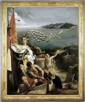 On 15 June the Venetians were becalmed between Mount Athos and Strati. They sailed north slightly in an attempt to get the wind gauge, but on 16 June the Ottoman fleet appeared to windward (NE). Flangini tried to form a NNW line but some ships couldn't keep station and he formed an ESE line instead. At about 9am fighting began in the Van and included all of the line in about 30 minutes. Flangini, hit at midday by a musket ball in the neck, fell unconscious and was at first believed dead, just as the nearly dismasted flagship of Hodja Ibrahim Pasha was towed out of the battle line by two galiots.[9] At 2:30 pm, after 5 hours of fighting, the Ottoman fleet withdrew towards Lemnos with 6 ships more or less dismasted and the Venetians, left without orders, lost an opportunity of going about and getting the wind gauge, and instead retired to Thermia. The Venetian fleet lost this day 261 killed and 543 wounded: Flangini's flagship, the Leon Trionfante, lost 87 killed and wounded, and her next astern, the Madonna dell'Arsenal, 109. Flangini's despatch of 21 June accounted for 833 casualties, making about 1390 casualties for the whole battle.[10][N 2]