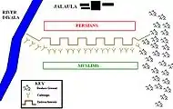 At Jalula, both the flanks of Persians and Muslims rested upon natural obstacles. Diyala River on east and broken ground on the west. Broken ground was unsuitable for cavalry and even the movement of infantry en masse was difficult and would have exposed them to Persian Fire-Power.
