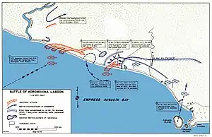 The force sailed initially on the night of 1 November; however, the force was sighted by US aircraft, and a large US force subsequently dispatched to respond. This convinced the Japanese that a counterlanding at this time would be difficult, with the attempt postponed and the troops returned to Rabaul.[9] Losses during the naval battle of Empress Augusta Bay, further delayed the sailing of the force and another attempt was cancelled on 5 November after an air raid. The landing force finally departed Rabaul on 6 November, aboard four destroyers.[10] They were covered by a force under Rear Admiral Morikazu Osugi. This force included the cruiser Agano, and the destroyers Naganami, Wakatsuki, Shigure, Samidare, Shiratsuyu and Amagiri.[11]