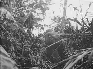 On the morning of 9 November, the area between the Marine positions and the Laruma River was bombed and strafed by American dive bombers from Munda Airfield on New Georgia.[22] Patrols found the bodies of many Japanese, who had taken refuge in the Laruma River area. There was no further enemy activity on the left flank of the perimeter, and at noon of that day, control of the sector passed to the US 148th Infantry Regiment of the 37th Division, which had just arrived. The battalion from the 9th Marines moved to the right flank, and the 1st Battalion, 3rd Marine Regiment withdrew to the 3rd Marine Regiment area. The 1st Battalion, 21st Marine Regiment held the left-flank and remained under operational control of the 148th Regiment until other units of the 37th Division arrived.[23]