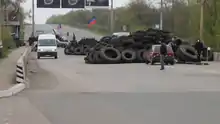 The standoff began on 12 April, when a group of separatists from the Donbass People's Militia attempted to capture a police station. A shootout with police followed, eventually leading to the capture of the building by the separatists.[17][18] After capturing the building, they tore the Ukrainian coat of arms off the building, and raised the flag of the Donetsk People's Republic.[19] The insurgents then issued an ultimatum stating that if the city's mayor and his subordinates did not swear allegiance to the People's Republic by Monday, they would "takeover the city council". A crowd of separatists later rallied around the city council building, entered it, and raised the flag of the People's Republic over it.[19][20] A representative of the Donetsk People's Republic addressed locals outside the captured police station, but was received negatively by the crowd.[19] On the outskirts of the city, some insurgents set up a checkpoint near a local military airfield.[21]