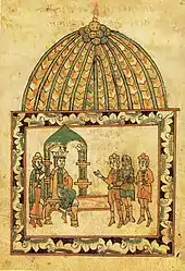 The Russian army was organized into six "regiments" - a Patrol, a Forward, two regiments of "Right" and "Left Hand," a Large regiment and an Ambush regiment. In turn, each of the regiments was divided into smaller tactical units - "banners" (a total of about 23).[34] On the field the army was arranged in multiple lines, and probably, the location of the regiments did not match their names (there is no evidence that the regiments of the Left and Right Hand disposed in line with the Large Regiment). The terrain did not allow for a broad front; probably, the units entered into battle gradually. The army's flanks were protected by ravines with dense thickets which excluded any chance for a surprise flank attack of a Horde. The Ambush regiment under the command of Vladimir the Bold and Dmitry Bobrok (brother-in-law of the Grand Prince) was hidden behind the line of Russian troops in an oak grove.[lower-alpha 1] The Grand Prince himself went to the front lines, leaving his trusted boyar Mikhail Brenok as the head of the Large Regiment under the great banner. He also exchanged with the boyar horses and gave him a coat and a helmet, so the Grand Prince could fight like an ordinary boyar, remaining unrecognized.[lower-alpha 2] The battle opened with a single combat between two champions.[lower-alpha 3] The Russian champion was Alexander Peresvet and The Horde's champion was Temir-murza (also Chelubey or Cheli-bey, also Tovrul or Chrysotovrul). During the first pass of the contest each champion killed the other with his spear and both fell to the ground. Thus, it remained unclear whose victory was predicted by the outcome of the duel.[35]