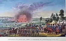 In the western front, the Austrian III Corps under General Giulay attacked the suburb of Lindenau and had success at first, forcing Marshal Ney to divert General Bertrand's IV Corps to hold the position.[41] But soon the French held, the fighting later ground down into a stalemate, and the Austrians were driven back not far from the village.[38] However, for the French, there was also a negative strategic consequence for this minor success. IV Corps was needed by Napoleon for his attacks on the main Austro-Russian armies positioned at the south, and since they did not take part in the attack as they were that time engaging the Austrians in Lindenau, his attack failed.[42]