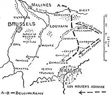 The Army of the Meuse (General Otto von Emmich) consisted of the 11th Brigade of III Corps (Major-General Friedrich von Wachter), the 14th Brigade of IV Corps (Major-General Friedrich von Wussow), the 27th Brigade of VII Corps (Colonel Benno von Massow), the 34th Brigade of IX Corps (Major-General Richard von Kraewel), the 38th Brigade of X Corps (Colonel Oertzen) and the 43rd Brigade of XI Corps (Major-General Hülsen).[17] The cavalry component consisted of Höherer Kavallerie-Kommando II (II Cavalry Corps [HKK II]), Lieutenant-General Georg von der Marwitz), consisting of the 2nd (Major-General Friedrich von Krane), 4th (Lieutenant-General Otto von Garnier) and the 9th (Major-General Karl-Ulrich von Bülow) cavalry divisions.[18] (A German Cavalry Corps was not an army corps in the conventional sense but the largest German cavalry unit that operated in 1914 and was known as a Höheres Kavallerie-Kommando.) The Army of the Meuse had c. 59,800 troops with 100 guns and howitzers, accompanied by Erich Ludendorff as an observer for the General Staff.[10]