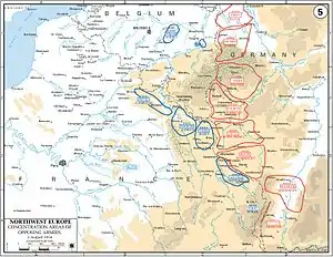 Under Plan XVII, the French peacetime army was to form five field armies of c. 2,000,000 men, with groups of Reserve divisions attached to each army and a group of reserve divisions on the flanks. The armies were to concentrate opposite the German frontier around Épinal, Nancy and Verdun–Mezières, with an army in reserve around Ste. Ménéhould and Commercy. Since 1871, railway building had given the French General staff sixteen lines to the German frontier against thirteen available to the German army and the French could wait until German intentions were clear. The French deployment was intended to be ready for a German offensive in Lorraine or through Belgium. It was anticipated that the Germans would use reserve troops but also expected that a large German army would be mobilised on the border with Russia, leaving the western army with sufficient troops only to advance through Belgium, south of the Meuse and the Sambre rivers. French intelligence had obtained a 1905 map exercise of the German general staff, in which German troops had gone no further north than Namur and assumed that plans to besiege Belgian forts were a defensive measure against the Belgian army.[4]