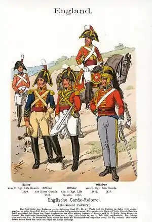 ![]() British heavy dragoons wore a red coat and black bicorne hat at Maguilla, similar to the trooper at far left. The helmet was not adopted until 1813 | |||||||