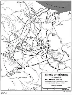 Allied plans for the attack on the Mareth Line continued virtually undisturbed.[26] On 17 March, the II US Corps began Operation Wop (sic), an attack towards Gafsa, the Eighth Army began the preliminary Operation Walk and Operation Canter and then began Operation Pugilist, the Battle of the Mareth Line on 19 March.[27]