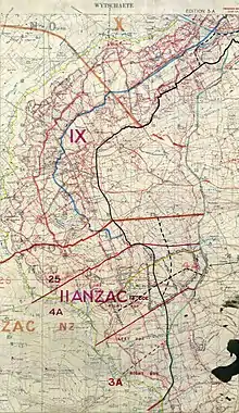 The British planned to advance on a 17,000 yd (9.7 mi; 16 km) front, from St Yves to Mt Sorrel, eastwards to the Oosttaverne line, a maximum depth of 3,000 yd (1.7 mi; 2.7 km).[41] Three intermediate objectives, originally to be reached a day at a time, became halts, where fresh infantry would leap-frog through to gain the ridge in one day. In the afternoon a further advance down the ridge was to be made.[42] The attack was to be conducted by three corps of the Second Army (General Sir Herbert Plumer). II Anzac Corps in the south-east was to advance 800 yd (730 m), IX Corps in the centre was to attack on a 5,000 yd (2.8 mi; 4.6 km) front, which would taper to 2,000 yd (1.1 mi; 1.8 km) at the summit and X Corps in the north had an attack front 1,200 yd (1,100 m) wide.[24] The corps planned their attacks under the supervision of the army commander, using analyses of the Somme operations of 1916 and successful features of the attack at Arras on 9 April as guides. Great care was taken in the planning of counter-battery fire, the artillery barrage time-table and machine-gun barrages.[43][lower-alpha 3]