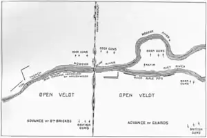 As the British troops came within 1,200 yards (1,100 m) of the river, Methuen remarked to Colville, "They're not here." Colville replied, "They're sitting uncommonly tight if they are".[5] At this point the Boers opened fire. Most of the British troops were forced to throw themselves flat. Some tried to advance in short rushes, but could find no cover on the veld. Few British troops got closer than 1,000 yards (910 m) to the Boers. The Guards tried to outflank the Boer left, but were unable to ford the Riet River. The British guns pounded the buildings near Modder River Station and the line of poplar trees which marked the north bank of the Modder, and entirely missed the enemy trenches on the south bank. Meanwhile, the Boer guns maintained a galling fire, and kept in action by repeatedly moving their positions.