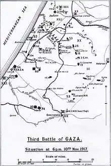 After the capture of Beersheba on 31 October, from 1 to 7 November, strong Ottoman rearguard units at Tel el Khuweilfe in the southern Judean Hills, at Hareira and Sheria on the maritime plain, and at Gaza close to the Mediterranean coast, held the Egyptian Expeditionary Force in heavy fighting. During this time the Ottoman Army was able to withdraw in good order; the rearguard garrisons retiring under cover of darkness during the night of 8/9 November 1917.[2]