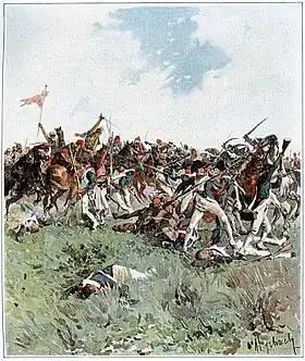 The Prevezans holding the centre, arrayed in two ranks and assisted by the French artillery, inflicted heavy casualties on their attackers, but after a few of their officers fled, they too broke in disorder.[24] As a result, the right redoubt was flanked and captured. Trying to reach the left redoubt, which was still resisting, Richemont was captured after a series of combats. While the left redoubt was still fighting, the fall of the right side of the French line opened the way to Preveza, and a mass of Albanian soldiers headed that way.[25] After a while, the left redoubt fell as well, and La Salcette taken prisoner. Tissot with 80 men tried to rescue his commander. Moving at speed through the ruins of Nicopolis, they repulsed cavalry attacks, but were finally stopped by the Albanian infantry and forced to conduct a slow fighting retreat.[26] On the extreme right of the French line, Tzarlabas and his Prevezans, aided by the Souliotes under the klepht Zacharakis, were still resisting until noon, when the Albanians abandoned the fight with them and Tissot's group and moved to capture Preveza.[26]