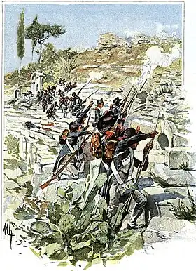 ![]() French troops fighting amidst the ruins of the ancient theatre of Nicopolis, painting by Felician Myrbach | |||||||