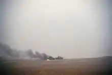 The breach was preceded by a heavy artillery barrage, led by VII Corps artillery units to soften up Iraqi VII Corps defenses.[53] Around 300 guns from multiple nations participated in the barrage. Over 14,000 rounds of artillery and over 4,900 M270 MLRS rockets were fired at Iraqi VII Corps forces during these raids.[4] Iraq lost close to 22 artillery battalions during the initial stages of this barrage.[19] This includes the destruction of approximately 396 Iraqi artillery pieces.[19] By the end of these raids Iraqi artillery assets had all but ceased to exist. One Iraqi unit that was totally destroyed during the preparation was the Iraqi 48th Infantry Division Artillery Group.[54] The group's commander stated his unit lost 83 of its 100 guns to the artillery preparation.[54] These raids were supplemented by air attacks by B-52 Stratofortress bombers and Lockheed AC-130 fixed wing gunships.[55] 1st Infantry Division Apache helicopters and B-52 bombers conducted raids against Iraq's 110th Infantry Brigade.[56] The 1st Engineer Battalion and 9th Engineer Battalion marked and proofed assault lanes under direct and indirect enemy fire to secure a foothold in enemy territory and pass the 1st Infantry Division and the British 1st Armoured Division forward.[20][57] 1st Infantry Division Artillery made a significant contribution to the battle. They would fire 11,752 rounds of the 45,641 rounds fired during all artillery missions during the conflict. 1-5 FA would contribute 5,313 rounds. 4-5 FA contributed 4,100 rounds and 4-3 FA would fire 2,339 rounds during all artillery missions during the Gulf War.[58] These three battalions would be the most active of all 28 of the 155mm battalions present in theatre.[58] On 20 February 1991 4-3 FA along with 2-29 FA, C 1-17 FA(MLRS), A 1-158 FA(MLRS), and A 6-27 FA(MLRS) participated in an artillery raid against multiple Iraqi targets. This raid led to the destruction of multiple Iraqi artillery and armor units along with multiple command posts.[59] On 23 February 1991 4-3 FA along with 1-17 FA, 1-142 FA, 2-142 FA, and 1-27 FA participated in another successful artillery raid. This raid led to the destruction of additional Iraqi artillery assets, maneuver, command, and logistics targets.[59] 1st Infantry Division Artillery and AH-64 Apache attack helicopters conducted operations against the Iraqi 26th Infantry Division.[60] B-52 bombers conducted missions against the Iraqi 48th Infantry Division.[61]