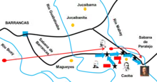 Martínez Campos had 400 infantry and 40 horsemen and heads for Barrancas, while Santocildes with 1,100 infantry and guerrillas travel to either Bueycito or Valenzuela, both meet and cross the Buey river pass and then divide, joining both in Barrancas. Campos informed by confidants of the presence of the Mambises in El Tanteo and other positions, evadeded the surprise attack.