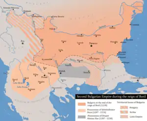 27,000–30,000, incl. 7,000 Cuman light and missile cavalry and 6,000 Bulgarian heavy cavalry, 1,800–2,200 rearguard (Gyuzelev, Angelov)[2][3] 18,000–24,000, incl. 6,000–9,000 Cuman light cavalry (Dimitrov)[4] 33,000 (Henry of Valenciennes) |