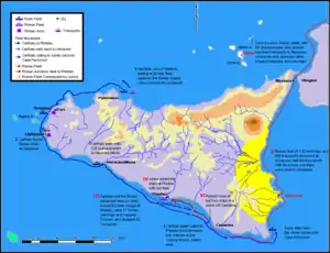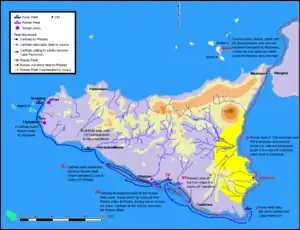In response, Lilybaeum was blockaded by a Roman fleet commanded by the year's consuls Publius Claudius Pulcher and Lucius Junius Pullus. Pulcher arrived in Sicily first with part of the fleet and took charge of the operations, while Junius stayed back in Italy to organize supplies and ready the remainder of the fleet. Carthage managed to resupply Lilybaeum through the exploits of a small squadron led by a commander named Hannibal, son of Hamilcar, who managed to break the siege in broad daylight and deliver supplies to the garrison of Lilybaeum. Hannibal left the city carrying the useless cavalry horses and sailed to the harbour of Drepana at night before the Romans knew what was happening and could respond.[2] This supply operation was repeated several times, which negated the whole effect of the blockade, since the Punic garrison was being fed and kept in contact with Carthage.[3]