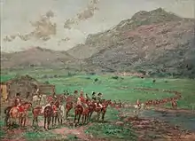 Deployed 800 yards from the French, these cannons were commanded by Reisner, Archduke John's chief of artillery.[22] The artillery barrage soon caused serious casualties in the vulnerable French squares. As some French troops began to shrink from the heavy fire, couriers raced off to get help.[23] Quickly, Eugène ordered twenty guns belonging to Broussier and Lamarque across the river. When the cannons arrived, the French formed their own 24-gun battery in front of the infantry and replied to Reisner's bombardment.[22] Wolfskeel asked for some infantry to be sent forward from the Piavisella line, but for some reason no help arrived.[21]