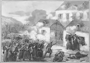 In the night of March 3/4, the Russians carried out a surprise attack on those rebels who slept in a building outside of the castle. Alarmed, the insurgents fought them, losing 2 men and then retreating from Pieskowa Skała. Those who failed to withdraw were killed by the Russians, and the castle itself was ransacked.[1] In the morning of March 4 the clash continued, as more Russian troops arrived to the area of Pieskowa Skała, chasing the insurgents, who tried to escape towards nearby Galicia. Among those insurgents who were killed in the battle was a Ukrainian revolutionary, Andrij Potebnia.