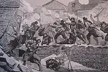 During the night of 27 November, the Serbs regrouped and at dawn managed to retake Pirot from the Bulgarians.[1] The column of Major Gudzhev attacked the Šumadija Division and the Bulgarians managed to push the Serbs to the river Temska. The retreat of the Šumadija Division forced the Drina Division to pull back as well and the Bulgarians pursued after them. On the left flank, the Bulgarians were also successful. The Serbs managed to hold on their position in the southern part of Pirot until the night.[1] Later the Bulgarians, pushed the Serbs from the city and attack Serbian army positions west of the town of Pirot.[4] The Serbians continued to hold a position to the south of the town till nightfall.