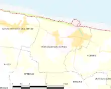 The main defences of Port-en-Bessin were on 200-foot (61 m) high cliffs known as the Western and Eastern features, either side of the hollow in which the port lay. An entrenched and concreted position had been built just south of the port on the Bayeux road, with more defences in the harbour.[2][5] Before the wireless was repaired to arrange covering fire, the Marines began a house-to-house battle through the port. The defensive position on the Bayeux road was charged and quickly overcome and its occupants captured. In the afternoon, after a bombardment by HMS Emerald and three squadrons of Typhoons firing RP-3 rockets, the cliff-top strong points were attacked and the base of the western feature captured.[5] A troop advanced on the eastern feature against rifle and machine-gun fire and grenades being thrown down the open slope, which was also mined and had hidden flame-throwers. When the Marines were well up the slope, two FLAK ships in the harbour opened fire, killing twelve and wounding 17 men, more than half the troop in a few minutes, forcing it to withdraw.[2]